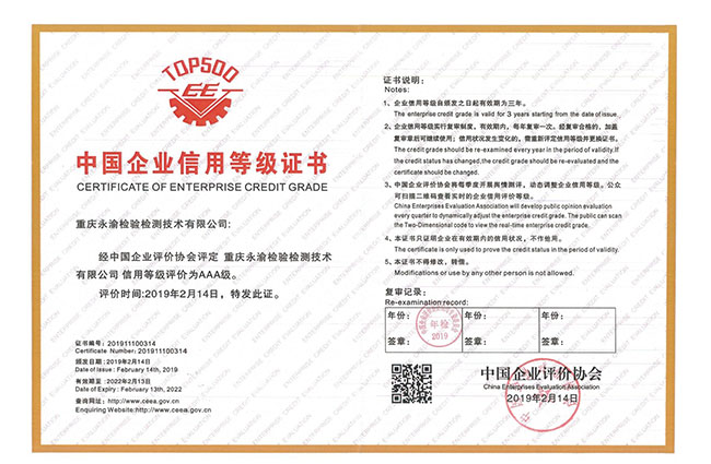 为加强中国行业的诚信建设,推动行业自律,2019年3月12日下午,永渝检测公司代表有幸参加到中国企业评价协会在重庆召开的“商务诚信体系建设工作说明会”及授牌仪式,重庆永渝检验检测技术有限公司荣获“中国企业信用等级AAA级证书”并成为“第六届中国企业评价协会会员单位”。