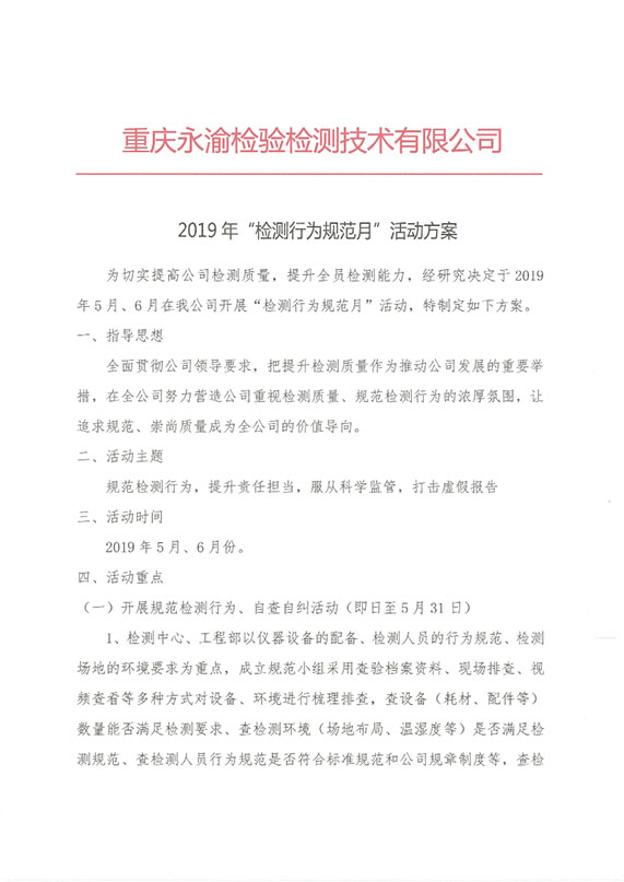 2019年4月23日,重庆永渝检验检测公司“检测行为规范月”拉开帷幕。