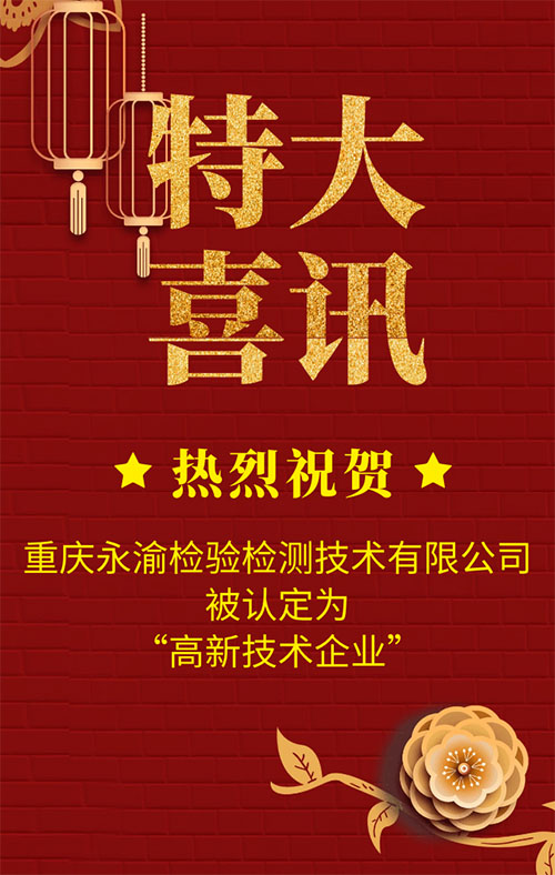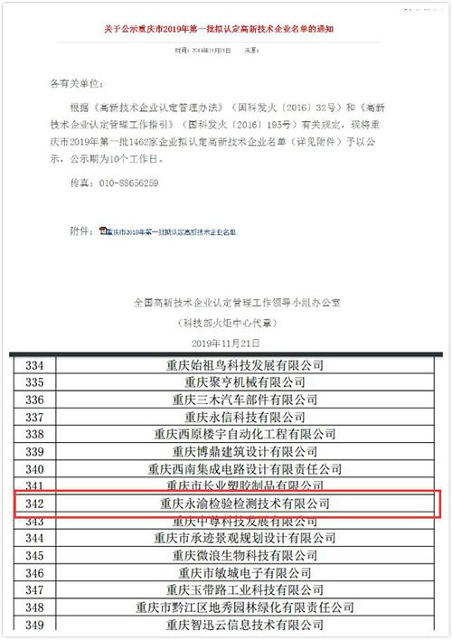 此前,重庆2019年最新一批高新技术企业名单正式公布,重庆永渝检验检测技术有限公司顺利通过重庆市科技局、重庆市财政局、国家税务总局重庆市税务局的审核荣耀上榜,凭借专业的检测队伍,雄厚的技术实力,持续的创新能力,严谨的科学管理,成功获得“高新技术企业”证书,正式成为高企一员。