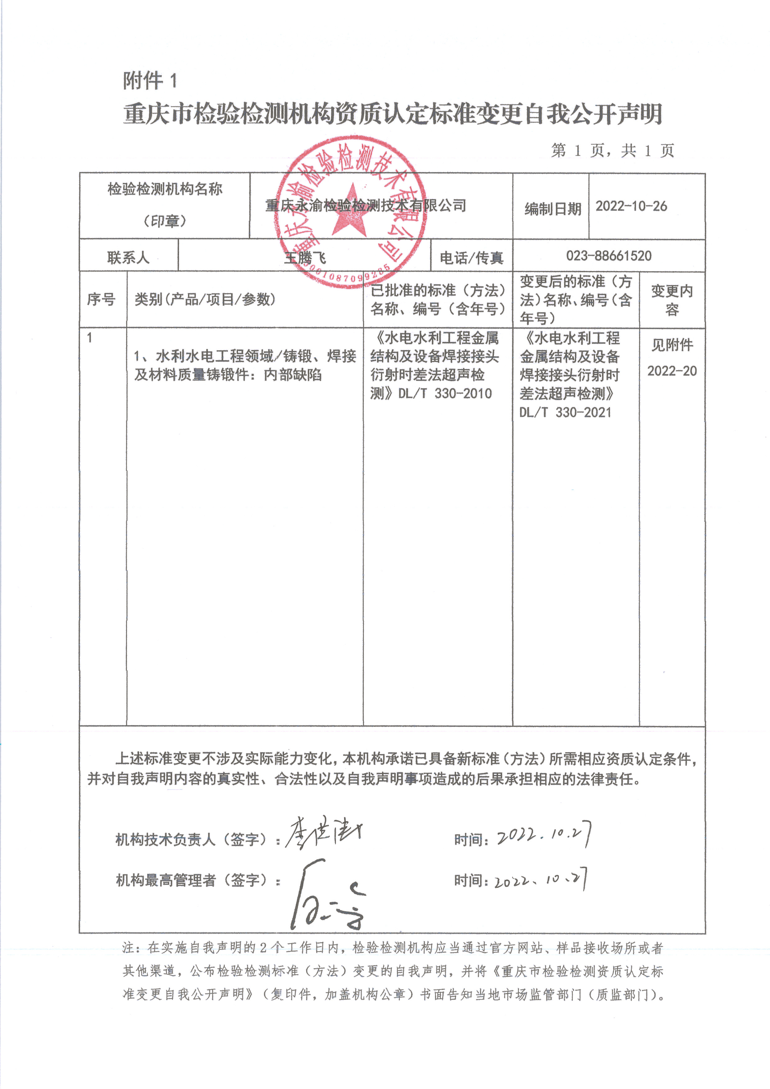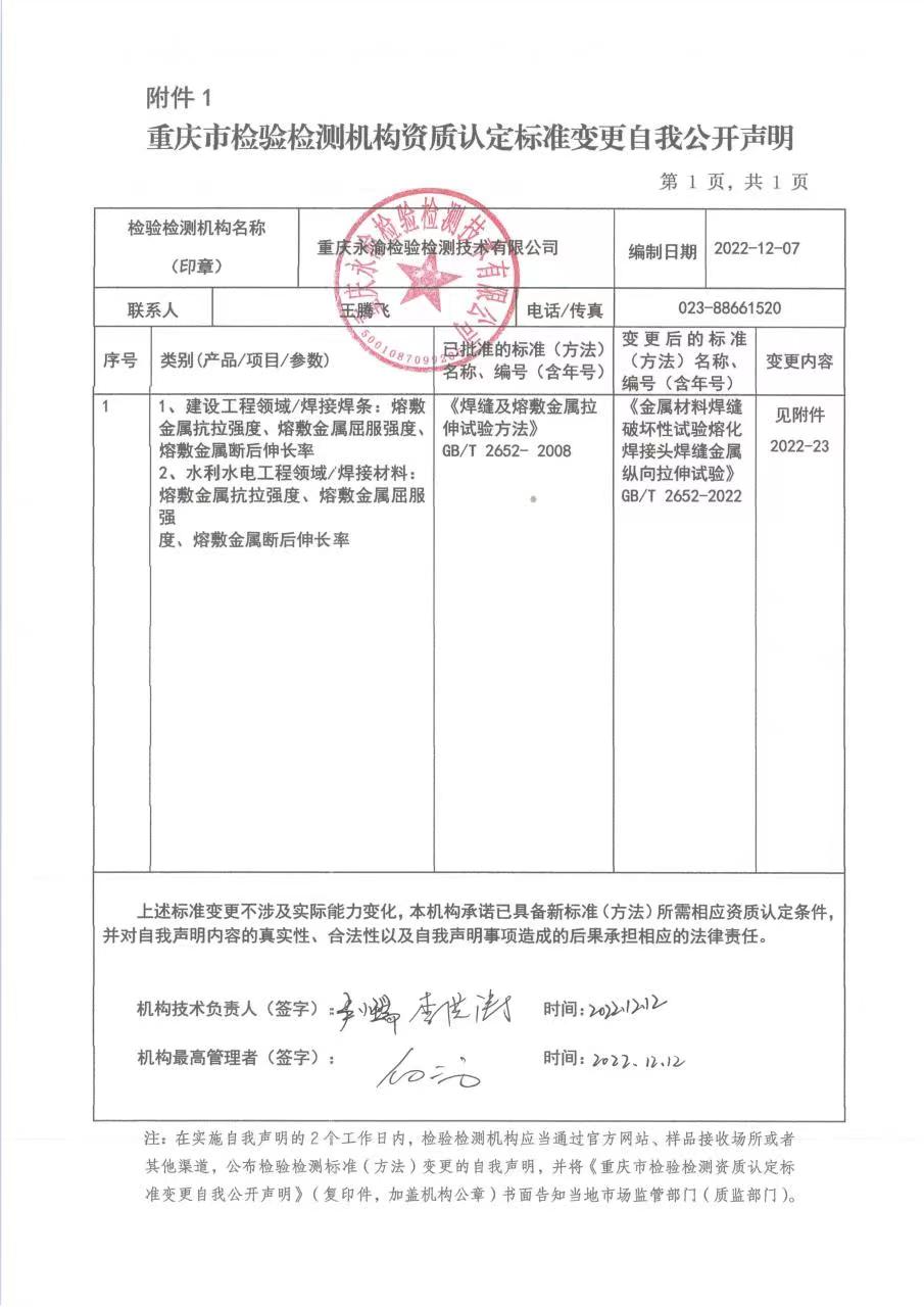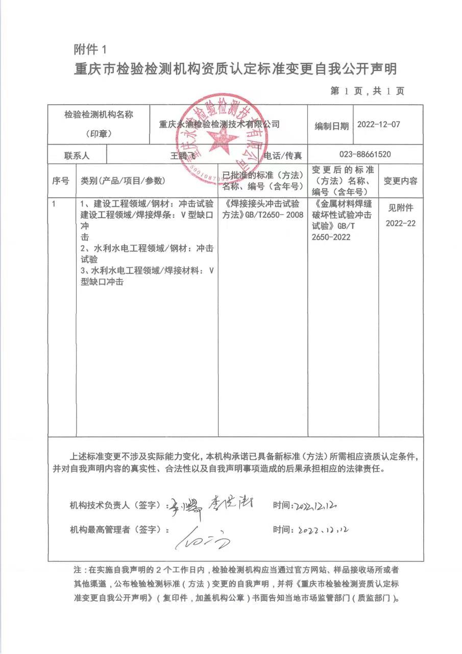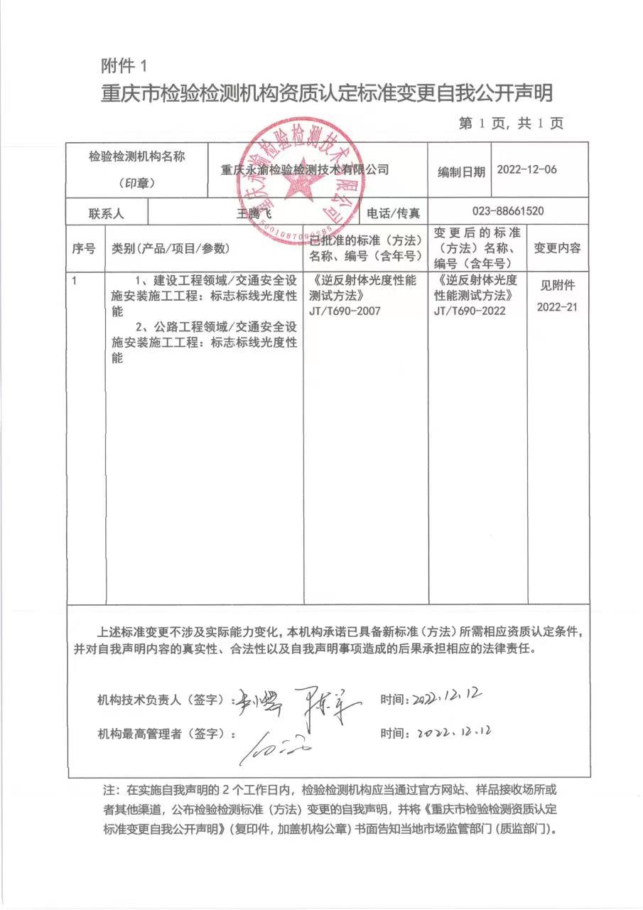 重庆市检验检测机构资质认定标准变更自我公开声明