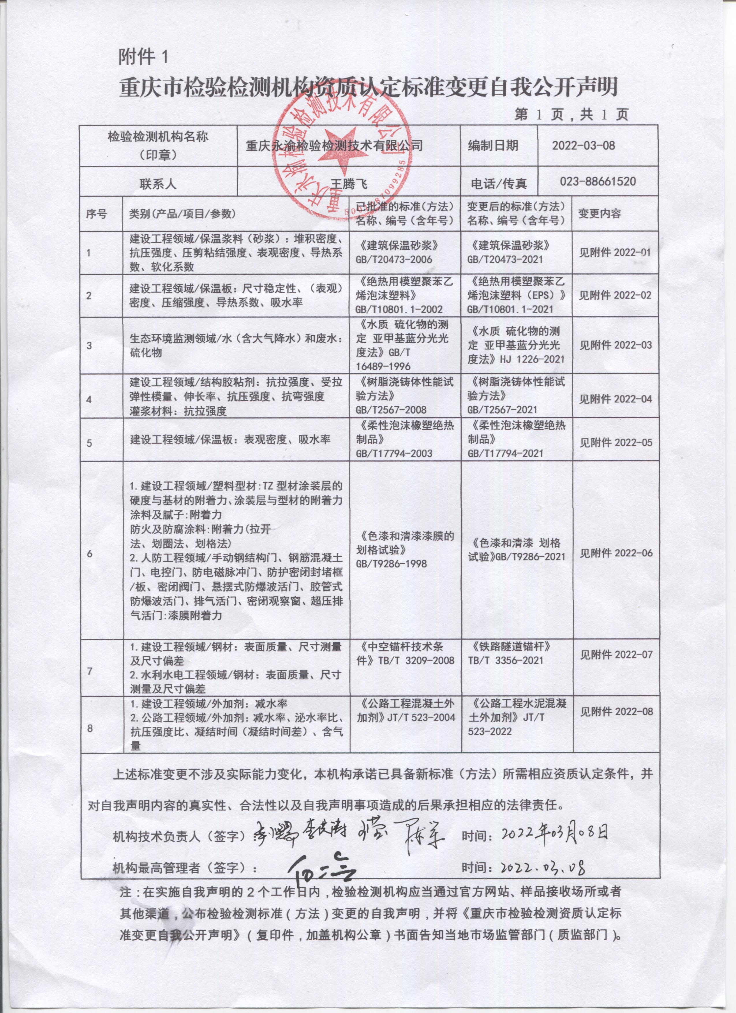 重庆永渝检验检测技术有限公司关于重庆市检验检测机构资质认定标准变更自我公开声明