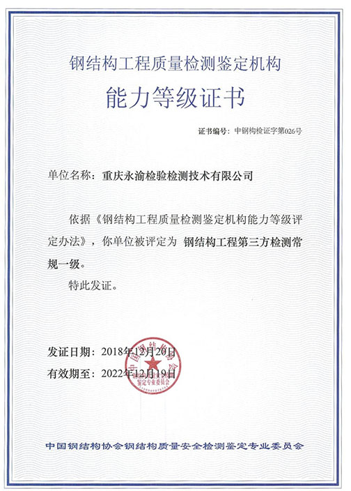 祝贺我司荣获钢结构工程第三方检测常规一级能力等级证书