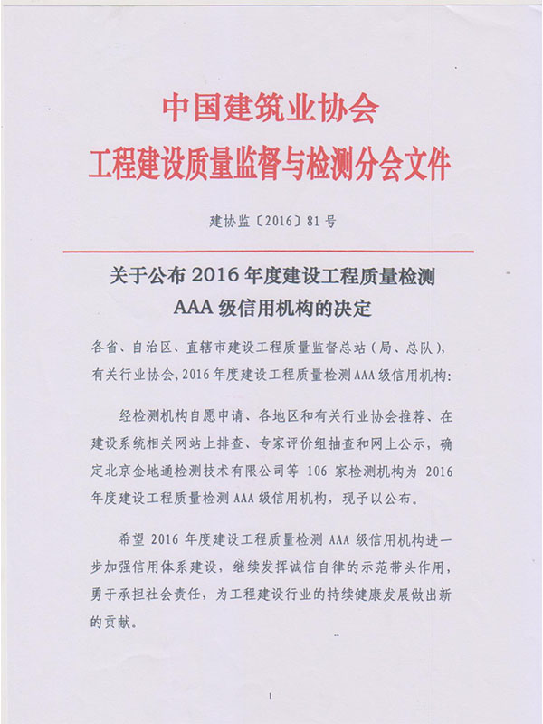 我司被中国建筑业协会工程建设质量监督与检测分会评为2016年度建设工程质量检测AAA级信用机构